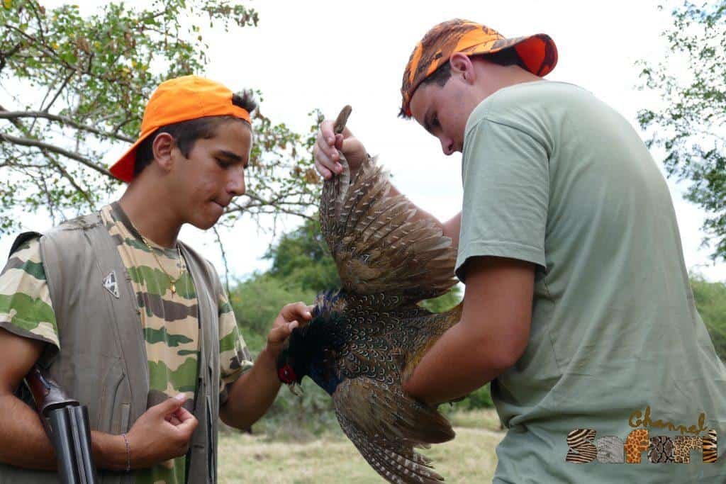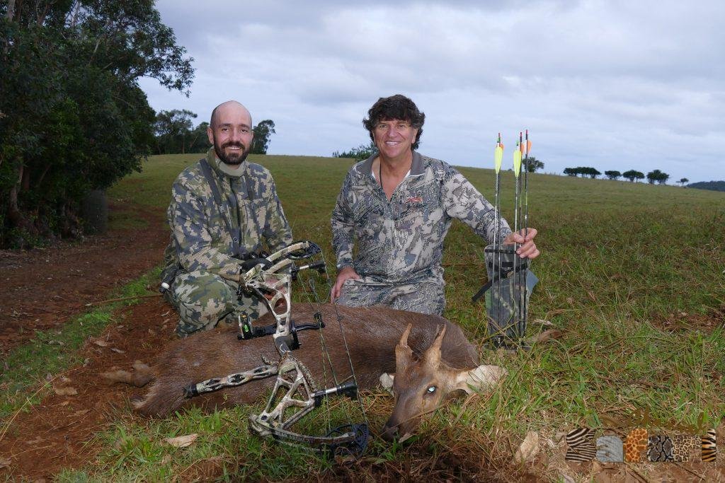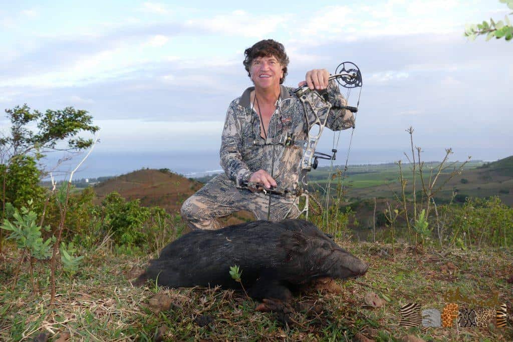 Така протече сутрешният риболов. Следобяд щяхме да се опитаме на ход да отсреляме още някое прасе и може би някой фазан. Както го бяхме планирали, така и се получи прекрасното прохладно време, благодарение на облаците само помогна за уникалния лов. Арчи успя още докато подхождахме към хълмовете с прасетата да отстреля два фазана и пропусна други два. Не е лесно да се уцели единственото уязвимо за стрелите място в основата на врата. След няколко снимки с красивите птици продължихме хода си към крайната ни цел в търсенето на прасетата. Но слуката, която ни споходи не можеше да бъде случайност. Бяхме пропътували няколко хиляди километра със самолет и бяхме дошли тук на остров отвъд Африка с намерението да ловуваме едно определено животно и то се бе скрило още през първия ни ловен ден. Така и не го видяхме повече, но ето, че сега всички стояхме в края на една поляна, а от другата й страна в присъствието на няколко женски и един два младежа стоеше нашия старец. Невероятните му трофейни рога бяха маскирани със сухи треви и храсти, но това бе той. Грешка нямаше. След като Лионел и Арчи се отърсиха от изненадата, с трескава бързина се върнаха в гората и започнаха обход по края и за да доближат стадото. Вятъра бе замрял, сякаш за да ни даде шанс да се приближим незабелязани. Когато разстоянието до стадото стана около 30 метра една от женските ни усети и даде знак с изсвирване на останалите да се оттеглят.