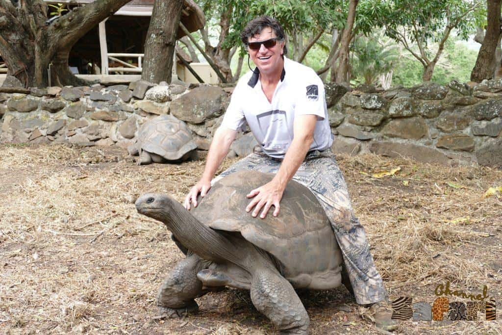 Командата на водача им ги освободи от вцепепението и те скочиха в храстите. Най-близо бе Арчи, готов за излитащите птици, но от храстите с невероятна скорост изскочи дива котка. Ловеца не бе готов за такъв развой, но въпреки това успя да стреля два пъти по пъргавото животно. Така и не намерихме дивата котка, но домакините бяха доволни, че все пак хищника е получил доза съчми и едва ли щеше да ловува отново техните фазани. Когато обработим видеокадрите ще можем да видим на забавен кадър тази ситуация, развила се за няколко секунди. Ловът продължи с гонка сред ниските храсти. 10-12 гонача с кучета бяха заели позиция пред ловците и сега бяха започнали с викове да се приближават към пусиите. Като по команда започнаха да се вдигат с шумни крясъци по един два фазана и прелитайки над пусиите давха възможност на ловците да се изявят с точността си. На няколко пъти Арчи успя да направи дуплет. Дори един от шумните едри фазани след точната му стрелба се взриви в облак от пера на около 10 метра пред ловеца и падна в краката му. Невероятна гледка, особено когато е заснета и на забавен каданс с кристално качество в 4К резолюция. Такива моменти не могат да се опишат – трябва да се видят, но поне това е гарантирано за тези от вас, които следят приключенията на ловеца по Хоби Лов или по Охота и рибалка. След като вятъра отнесе ефирното оперение останало от свалените на пусията фазани, гонката приключи. Арчи събра 4 мъжки фазана една женска и едно гинифо. Време беше за почивка и всички се върнаха обратно в ловната хижа за обяд. След многобройните и изкусно приготвени видове месни деликатеси, наричани тук карпачо успяхме да опитаме и прясно смляно току-що изсушено ароматно кафе. Домакините ни притежаваха огромни обработваеми площи на острова и отглеждаха захарна тръстика, кафе, палмови насаждения и всичко, което това райско кътче можеше да предложи на предприемчивите и гостопремни бизнесмени. Благодарение на техния успешен бизнес бе възможно и интродуцирането на елените като ловен вид тук на Мавриций. Те се бяха погрижили да създадат сигурно място и за опазването на големите сухоземни костенурки, обитаващи острова от хилядолетия. В оградената с големи скални късове площ близо до ловния дом имаше 10-тина костенурки. Всяка една бе с диаметър на корубата поне един метър. Ленивите великани нямаха нищо против да се снимаме с тях. Дори им бе изключително приятно някой да ги чеше по грубата кожа на вратовете им и се изпъваха при всеки допир, като жирафи в усилие да предоставят възможно най-голяма площ за чесане на двукраките доброволци. Арчи до такава степен се сприятели с един прастар мъжкар, че костенурката му позволи да се качи на корубата му. Въпросната костенурка домакините ни кръстиха Арчи, на името на своя приятел и обещаха, че от днес нататък той ще получава допълнителна дажба кактуси.