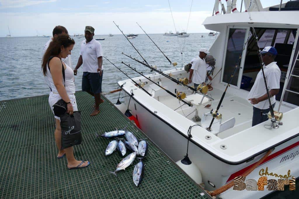 Когато приключих със снимките и се качих на лодката бяхме готови за риболова на мерлин. Опитните риболовни водачи пуснаха няколко огромни силиконови примамки след лодката. Изкусно оформените октоподи и разни неиндитифицирани синьо-лилави животни с блестящи ресни щяха да са стръвта. Капитана с вещина насочваше лодката и оглеждаше океана за присъствието на морски птици близо до повърхността. Скоро открихме едно такова струпване и в момента, в който преминавахме край пикиращите над водата хищници, въдиците засвириха. Първо една и веднага след нея още две. Арчи сложи колана и започна да тегли едната, а капитана и един от моряците се заеха с другите две въдици. Дебелите влакна и огромните макари подсигуриха улова на дърпащите с две ръце рибари. С доста усилия Арчи бе успял да изтегли до борда на лодката голямата близо 60-70 сантиметра туна. С ловко двежение третия моряк изтегли сребристо-огледалната риба в лодката с помощта на дълга кука. След това и от другите две въдици изтегли още 2 близнака на първата туна. Всички си приличаха по размер и форма. След като прибраха въдиците за наша най-голяма изненада започнаха да приготвят току що уловените 3-4 килограмови екземпляри за пускане обратно във водата като стръв. Сложиха осигурително влакно през устата им и ги пуснаха зад лодката на още по-дебело влакно. Влачихме стръвта така в продължение на повече от 2 часа, но слука нямаше. Дори отказахме да се приближим до сините китове, плуващи на няколко километра от нас, за да опитаме късмета си в риболова на мерлин, но за жалост слуката на лова не ни помогна в морето.