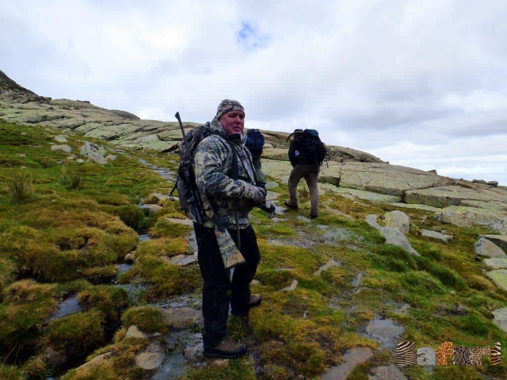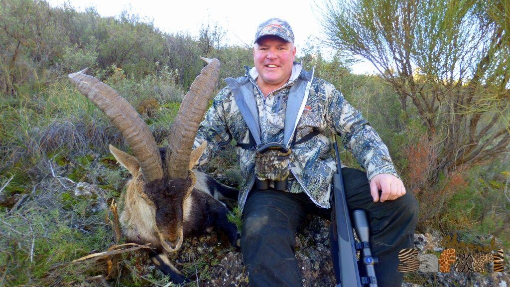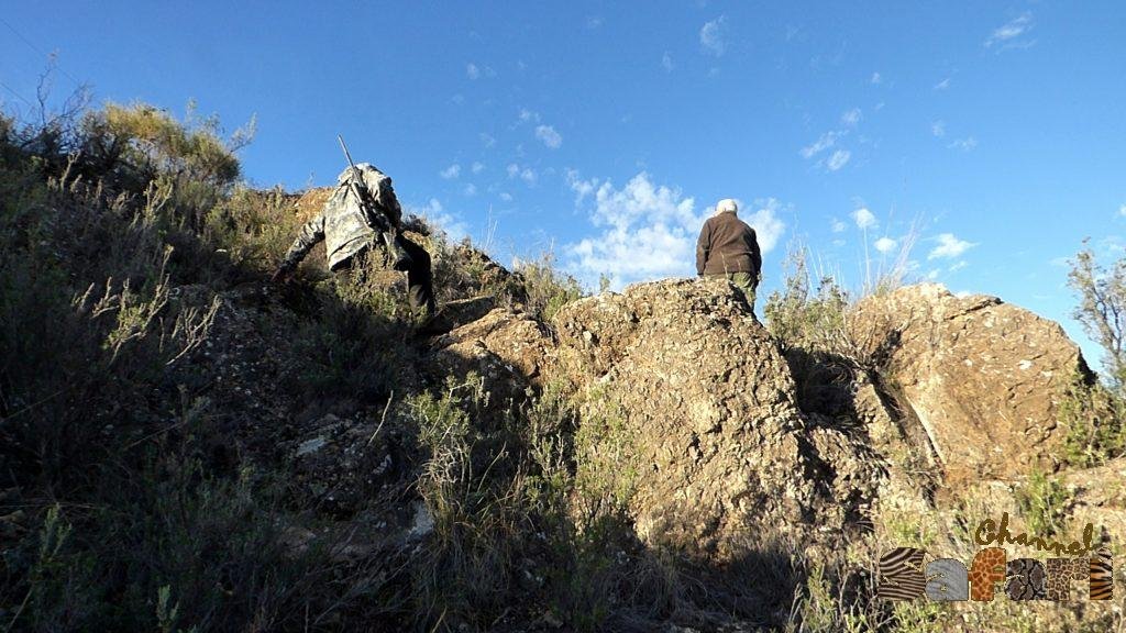 След час пътя започна да се изкачва в подножието на планинска верига. Тук намалихме темпото и водача ни започна да се заглежда по обраслите с ниски храсти възвишения. Освен нашата кола имаше и още една, в която се беше качил един „съгледвач“. Идеята беше, ако успеем да локализираме животно някъде, съгледвача трябваше да ни насочва за движението на преследваното животно. В 10 часа отбихме от пътя и спряхме до ниско възвишение. Съгледвачът ни бе локализирам група животни от другата страна на хълма. Изскочихме от колата и тръгнахме след нашия водач. От едната страна на хълма имаше удобен черен път, който щеше да ни изведе на перфектната стрелкова позиция, но вятъра бе неблагоприятен и поехме към стръмния склон от другата страна. Придвижвахме се бавно и трудно, защото една погрешна стъпка и щяхме да се озовем на километър по-надолу, затрупани от скални отломъци. Водачът ни започна да се оглежда по-внимателно и скоро направи знак на Питър да се приближи бързо. Двамата застанаха един до друг, прикрити от трънливите храсти. Точно пред нас на 70-80 метра имаш един мъжки, който следваше по петите женска. Пит трябваше да стреля бързо, защото женската ни бе усетила. Изстрелът бе през храсти и тръни и ловеца реши да го повтори, за да не се мъчи животното. Часът бе точно 10. 25, а ние вече имахме и второто трофейно животно – 9 годишен Сиера Невада айбекс.